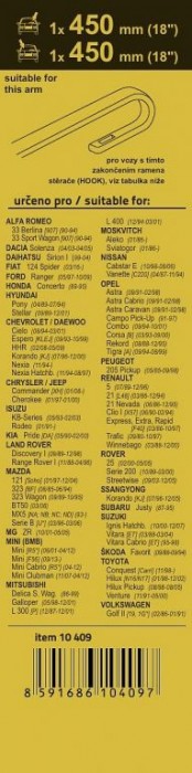 Sada dvou plochých stěračů FLAT (řidič + spolujezdec) se speciálním uchycením. Délky stěračů a systém uchycení na ramínko jsou přizpůsobeny vybraným vozům (viz tabulka použití). Vysoce kvalitní pružný člen plochého stěrače zajišťuje stejnoměrný tlak grafitového břitu v celé jeho délce.