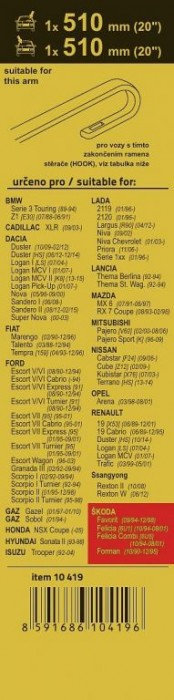 Sada dvou plochých stěračů FLAT (řidič + spolujezdec) se speciálním uchycením. Délky stěračů a systém uchycení na ramínko jsou přizpůsobeny vybraným vozům (viz tabulka použití). Vysoce kvalitní pružný člen plochého stěrače zajišťuje stejnoměrný tlak grafitového břitu v celé jeho délce.