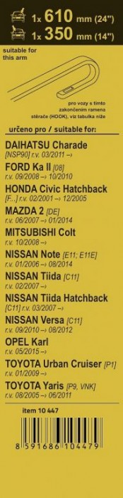 - určeno pro vozy: Daihatsu Charade [NSP90] 03/11 - Ford Ka ll [08] 09/08 - 10/10 Honda Civic Hatchback [F...] 02/01 - 12/05 Mazda 2 [DE] 06/07 - 12/14 Mitsubishi Colt 10/08 - Nissan Note [E11; E11E] 01/06 - 08/14 Nissan Note [E12] 08/13 - Nissan Tiida [C11] 02/07 - Nissan Tiida Hatchback [C11] 03/07 - Nissan Versa [C11] 09/10 - 08/12 Opel Karl 05/15 - Toyota Urban Cruiser [P1] 01/09 - Toyota Yaris [P9, VNK] 08/05 - 06/11