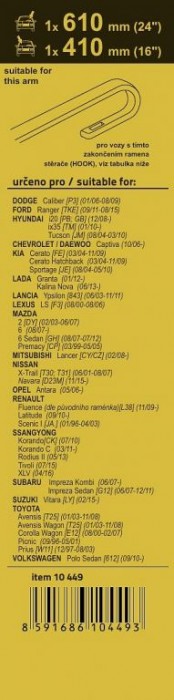 - určeno pro vozy: Dodge Caliber [P3] 01/06 - 08/09 Ford Ranger [TKE] 09/11 - 08/15 Hyundai i20 [PB] 12/08 - Hyundai i20 [GB] 11/14 - Hyundai ix35 [TM] 01/10 - Hyundai Tucson [JM] 08/04 - 03/10 Chevrolet / Daewoo Captiva [KL1C, C1..] 10/06 - Kia Cerato [FE] 03/04 - 11/09 Kia Cerato Hatchback 03/04 - 11/09 Kia Sportage [JE] 08/04 - 05/10 Lada Granta 01/12 - Lada Kalina Nova 06/13 - Lancia Ypsilon [843] 06/03 - 11/11 Lexus LS [F3] 08/00 - 08/06 Mazda 2 [DY] 02/03 - 06/07 Mazda 6 08/07 - Mazda 6 Fastback [GH] 08/07 - 09/12 Mazda 6 Sedan [GH] 08/07 - 07/12 Mazda 6 Wagon [GH] 12/07 - 09/12 Mazda Premacy [CP] 03/99 - 05/05 Mitsubishi Lancer [CY/CZ] 02/08 - Nissan Navara [D23M] 11/15 - Nissan X-Trail [T30; T31] 06/01 - 08/07 Opel Antara 05/06 - Renault Fluence [L38] (ramínko HOOK) 11/09 - Renault Latitude 09/10 - Renault Scénic I [JA.] 01/96 - 04/03 Ssangyong Korando [CK] 07/10 - Ssangyong Korando C 03/11 - Ssangyong Rodius II 05/13 - Ssangyong Tivoli 07/15 - Ssangyong XLV 04/16 - Subaru Impreza Kombi 06/07 - Subaru Impreza Sedan [G12] 06/07 - 12/11 Suzuki Vitara [LY] 02/15 - Toyota Avensis [T25] 01/03 - 11/08 Toyota Avensis Liftback [T25] 01/03 - Toyota Avensis Wagon [T25] 01/03 - 11/08 Toyota Corolla Wagon [E12] 08/00 - 02/07 Toyota Picnic 09/96 - 05/01 Toyota Prius [W11] 12/97 - 08/03 VW Polo Sedan [612] 09/10 -