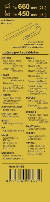 - určeno pro vozy: Citroën C5 [X4] 03/01 - 11/03, Citroën C5 Break [X4] 06/01 - 11/03, Citroën Jumpy [U64] 10/95 - 01/07, Honda Civic Hatchback [FK/FN] 09/11, Honda Civic Tourer [FK] 12/13, Honda FR-V [BE] 01/05 - 06/09, Honda HR-V [RU] 08/15, Hyundai Accent Blue [RB] 01/11, Hyundai Sonata [YF] 09/99, Hyundai Veloster 06/11, Chevrolet / Daewoo Malibu [KL1G,V300] 03/12 , Chrysler / Jeep Cherokee [KL] 01/14, Infiniti Q45 [F50] 01/01 - 12/06, Kia Carnival III [MB] 04/06, Lexus CT200h 12/10, Lexus ES [V6] 09/12, Lexus GS [L1] 01/12, Lexus IS [E3] 04/13, Lexus LX [J2] 02/12, Mitsubishi Galant 09/04 - 08/12, Mitsubishi Outlander [GF] 04/12, Nissan Almera Tino [V10M] 05/00 - 12/05, Nissan Maxima [A34] 01/00 - 01/06, Nissan Maxima QX [CA33] 01/00 - 01/06, Nissan Murano [Z50] 09/04 - 12/08, Nissan Primera Hatchback [P12E] 05/02, Nissan Primera Sedan [P12E] 12/01 - 09/10, Nissan Primera Wagon [P12E] 12/01, 09/10, Peugeot 406 Coupe [D8; D9] 03/97 - 02/05, Peugeot Expert [U64] 09/95 - 01/07, Renault Avantime [XEO] 09/01 - 12/03, Renault Espace III [JE0] (bez ostřikovače na stěrači) 10/96 - 10/02, Smart (MMC) Forfour [454] 01/04 - 06/07, Subaru Legacy [B14] 06/09, Subaru Outback [B14] 06/09, Toyota Camry [V3] 08/01 - 01/06, Toyota Camry [V5] 08/11, Toyota Picnic 02/00 - 01/06, Toyota Sienna 09/06 -