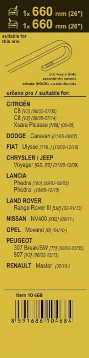 - určeno pro vozy: Citroën C8 [V3] 06/02 - 07/05, Citroën C8 [V3] 08/05 - 07/14, Citroën Xsara Picasso [N68] 01/00 - 09/05, Dodge Caravan [NS, RS] 01/95 - 08/07, Fiat Ulysse [179..] 10/02 - 12/10, Chrysler / Jeep Voyager [GS, RS] 01/95 - 12/09, Lancia Phedra [180] 09/02 - 09/05, Lancia Phedra 10/05 - 12/10, Land Rover Range Rover III [LM] 03/02 - 01/13, Nissan NV400 [X62] 09/11 - , Opel Movano [B] 04/10 , Peugeot 307 Break/SW [T5] 03/02 - 05/05, Peugeot 807 [V2] 06/02 - 12/13, Renault Master 02/10 -