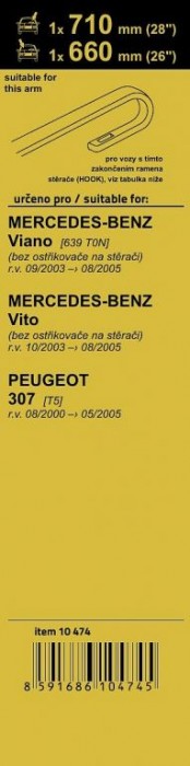 - určeno pro vozy: Mercedes-Benz Viano [639 T0N] (bez ostřikovače na stěrači) 09/03 - 08/05, Mercedes-Benz Vito (bez ostřikovače na stěrači) 10/03 - 08/05, Peugeot 307 [T5] 08/00 - 05/05