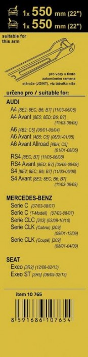 Sada dvou plochých stěračů typu Flat double (řidič + spolujezdec) se speciálním uchycením. Dopřejte si zásobu těchto kvalitních stěračů. Délky stěračů a systém uchycení na ramínko jsou přizpůsobeny těmto vybraným vozům - Audi A4 [8E2; 8EC; B6; B7] 11/03 - 06/08, Audi A4 Avant [8E5; 8ED; B6; B7] 11/03 - 06/08, Audi A6 [4B2; C5] 06/01 - 05/04, Audi A6 Avant [4B5; C5] 06/01 - 01/05, Audi A6 Avant Allroad [4BH; C5] 01/01 - 08/05, Audi RS4 [8EC; B7] 11/05 - 06/08, Audi RS4 Avant [8ED; B7] 05/06 - 06/08, Audi S4 [8E2; 8EC; B6; B7] 11/03 - 06/08, Audi S4 Avant [8E2; 8EC; B6; B7] 11/03 - 06/08, Mercedes-Benz Serie C 07/03 - 08/07, Mercedes-Benz Serie C (T-Modell) 07/03 - 08/07, Mercedes-Benz Serie CLC [203] 03/08 - 10/10, Mercedes-Benz Serie CLK (Cabrio) [209] 09/01 - 12/09, Mercedes-Benz Serie CLK (Coupé) [209] 08/01 - 04/09, Seat Exeo [3R2] 12/08 - 02/13, Seat Exeo ST [3R5] 06/09 - 02/13