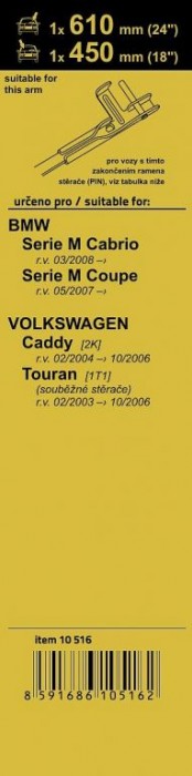 - určeno pro vozy: BMW Serie M Cabrio 03/08 , BMW Serie M Coupe 05/07, VW Caddy [2K] 02/04 - 10/06, VW Touran [1T1] (souběžné stěrače) 02/03 - 10/06
