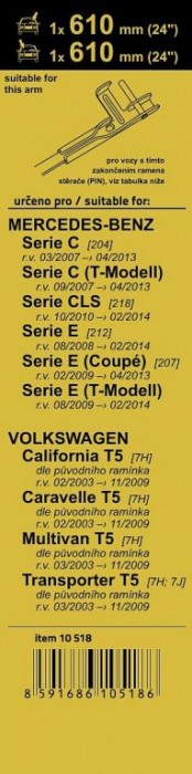 - určeno pro vozy: Mercedes-Benz Serie C [204] 03/07 - 04/13, Mercedes-Benz Serie C (T-Modell) [204] 09/07 - 04/13, Mercedes-Benz Serie CLS [218] 10/10 - 02/14, Mercedes-Benz Serie CLS Shooting Brake [218] 06/12 - 02/14, Mercedes-Benz Serie E [212] 08/08 - 02/14, Mercedes-Benz Serie E (Coupé) [207] 02/09 - 04/13, Mercedes-Benz Serie E (T-Modell) [212] 08/09 - 02/14 VW California T5 [7H] (ramínko PIN) 02/03 - 11/09, VW Caravelle T5 [7H] (ramínko PIN) 02/03 - 11/09, VW Multivan T5 [7H] (ramínko PIN) 03/03 - 11/09, VW Transporter T5 [7H, 7J] (ramínko PIN) 03/03 - 11/09
