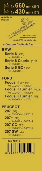 - určeno pro vozy: BMW Serie 6 [F13] 10/11, BMW Serie 6 Cabrio [F12] 03/11, BMW Serie 6 GC [F06] 05/12, Ford Focus II [04, 08] 07/04 - 12/11, Ford Focus II Turnier [04, 08] 07/04 - 10/08, Ford Focus II Turnier [08] 11/08 - 12/11, Peugeot 207 [A7] 05/06 - 04/12, Peugeot 207+ [A7] 11/12 - 06/15, Peugeot 207 CC [A7] 03/07 - 06/15, Peugeot 207 SW [A7] 06/07 -