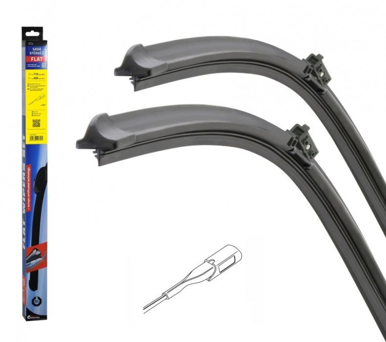 Sada dvou plochých stěračů FLAT (řidič + spolujezdec) se speciálním uchycením. Délky stěračů a systém uchycení na ramínko jsou přizpůsobeny vybraným vozům (viz tabulka použití).