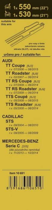 - určeno pro vozy: Audi TT Coupe [8J3] 07/06 - 08/15, Audi TT Roadster [8J9] 02/07 - 06/14, Audi TT RS Coupe [8J3] 07/09 - 06/14, Audi TT RS Roadster [8J9] 07/09 - 06/14, Audi TTS Coupé [8J3] 05/08 - 08/15, Audi TTS Roadster [8J9] 05/08 - 06/14, Cadillac STS 09/04 - 08/10, Cadillac STS-V 09/05 - 08/09, Mercedes-Benz Serie C [205] (ramínko SLOT) 11/13 - 10/14