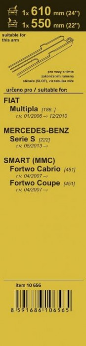 - určeno pro vozy: Fiat Multipla [186..] 01/06 - 12/10, Mercedes-Benz Serie S [222] 05/13, Smart (MMC) Fortwo Cabrio [451] 04/07, Smart (MMC) Fortwo Coupe [451] 04/07