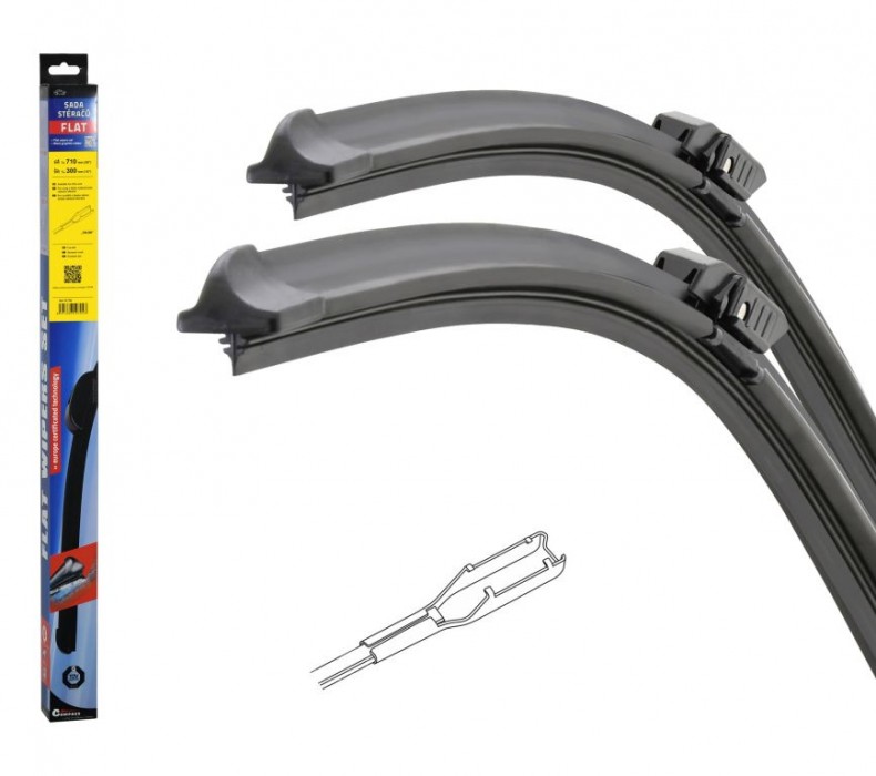 Sada dvou plochých stěračů FLAT (řidič + spolujezdec) se speciálním uchycením. Délky stěračů a systém uchycení na ramínko jsou přizpůsobeny vybraným vozům (viz tabulka použití).