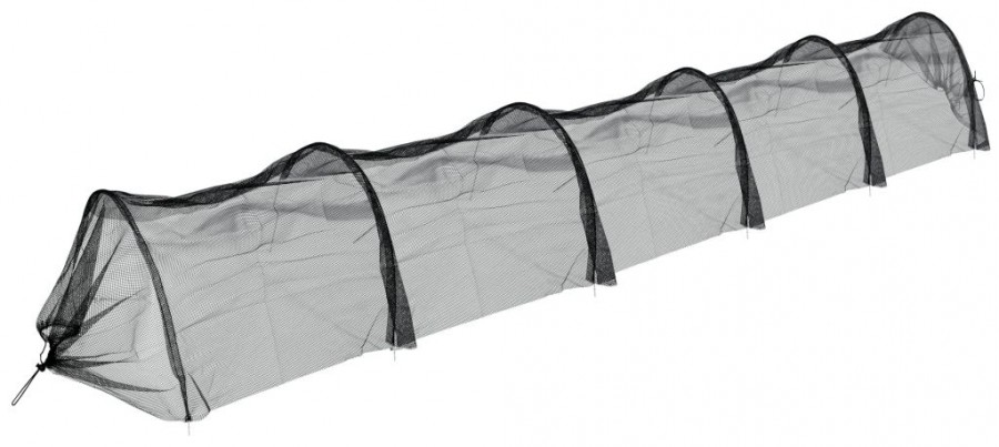 Ochranný tunel pro rostliny z černé polyesterové síťoviny.