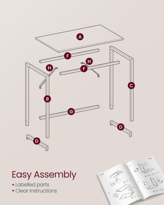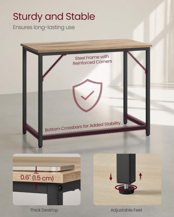 Odolná deska z dřevotřísky a pevný ocelový rám garantují dlouhou životnost a stabilitu. Montáž zvládnete rychle díky jasným instrukcím. Nastavitelné nožky zajistí stabilitu na každém povrchu a ochrání podlahu před poškozením.