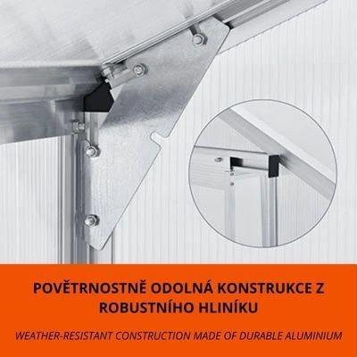 Hliníková konstrukce je lehká, ale mimořádně pevná, což zaručuje dlouhou životnost. Polykarbonátové desky chrání před UV zářením a zajišťují dostatek světla. Základ z pozinkované oceli poskytuje stabilitu a bezpečné ukotvení. Snadná montáž a údržba potěší každého zahrádkáře.