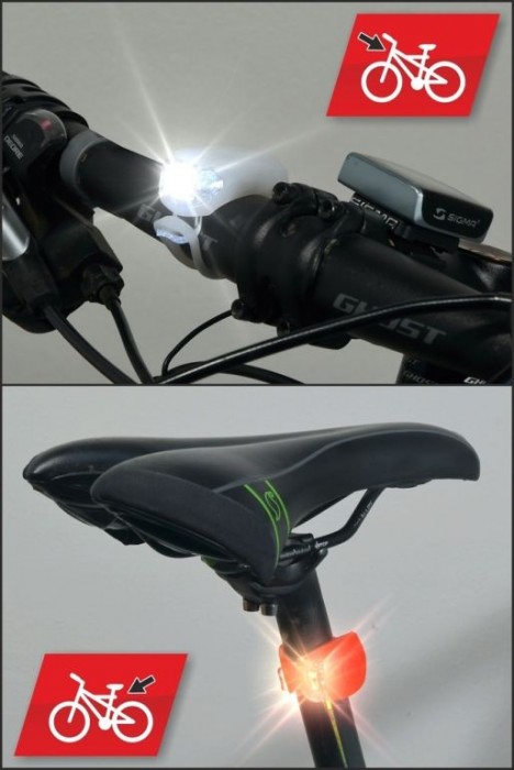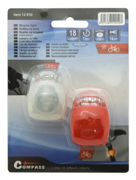 Svítilna na kolo, kočárek, či koloběžku s jednoduchým systémem upevnění pomocí pružných silikonových objímek. Lze snadno připevnit např. na řidítka, tyč pod sedlem, či jinou část jízdního kola. Lze použít na řidítka s různými průměry. Sada je složena ze dvou kusů, kdy jedno světo je bílé a jedno červené, světla nabízí dosvit do 15 metrů a světelný tok 18 lm. Ovládání je řešeno stisknutím skrytého spínače na vrchní části. Světlo tak nabízí 3x režimy (stálé svícení / rychlé blikání / pomalé blikání). Baterie lze jednoduše vyměnit sejmutím silikonového obalu z těla svítilny a odejmutím krytky baterií.