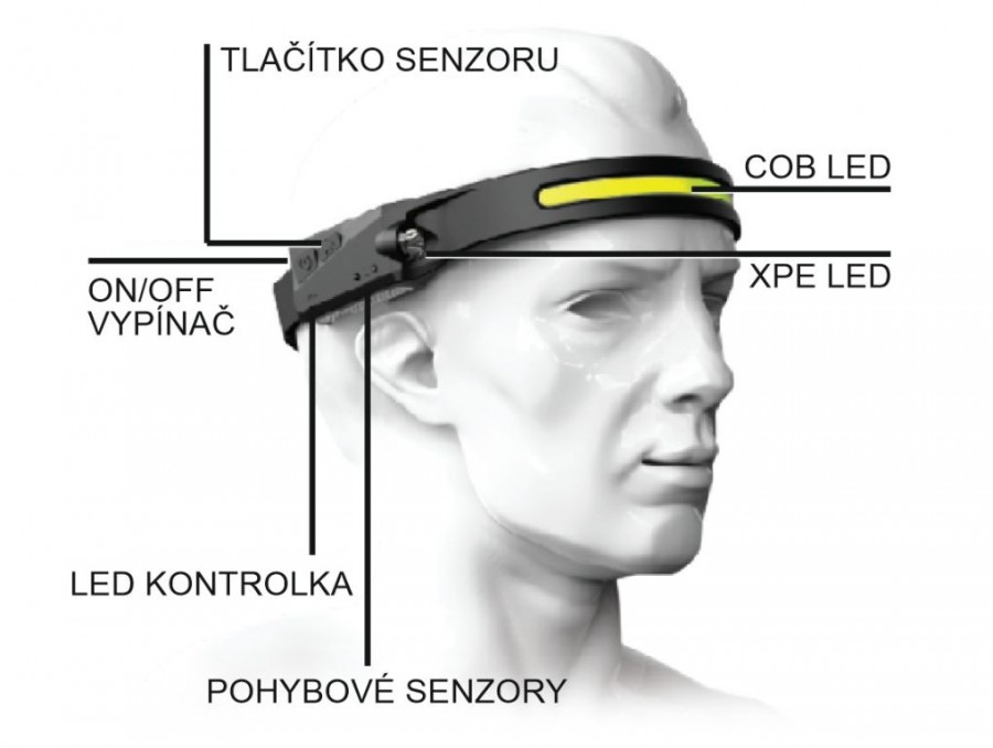 Hlavní zdroj světla je vysoce svítivá Cree XP-E LED se svítivostí 150/60lm, která je opatřená reflektorem pro zvýšení optického výkonu s dobou svícení 4/8 hod dle intenzity svícení. Pásek je tvořen COB diodami o svítivosti 350/150 lm s dobou svícení 2,5/5 hodin dle nastavené intenzity svícení. Čelovka je opatřena pohybovým senzorem, který umožňuje ovládání mávnutím ruky okolo svítilny (senzoru), po jeho aktivaci pomocí tlačítka senzoru na boku svítidla. Čelovku je rovněž možné ovládat běžným cyklováním pomocí tlačítka vypínače na boku těla. Svítilna nabízí celkem 5x režimů svícení, 4x běžné režimy svícení (normální, nebo slabé osvětlení obou svítidel zvlášť), ale rovněž je možné aktivovat SOS blikání obou svítidel a to stiknutím obou tlačítek těla čelovky naráz. O napájení se stará vestavěná baterie s kapacitou 1200mAh. Nabíjení je řešeno pomocí přiloženého USB-C kabelu. LED signalizace během nabíjení svítí červeným světlem a po dokončení procesu nabíjení svítí zeleně. Tělo čelovky má drobné rozměry a nízkou hmotnost 70 g. Silikonový popruh je délkově nastavitelný a zajišťuje vysokou míru pohodlí. Čelovku je tak možné použít na jakkoliv velkou hlavu.