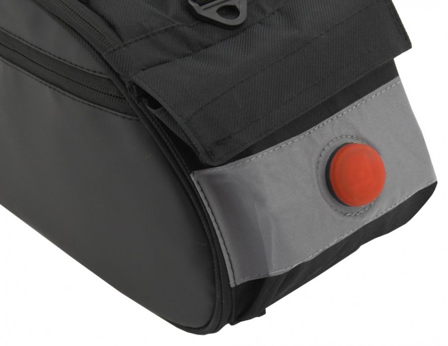 Praktická cyklotaška s několika kapsami, pro nosič jízdního kola. Brašna je opatřena hlavní 11L kapsou a postranní kapsou na zip, dále kapsou na zadní straně brašny vhodnou na drobnosti se zapínáním na suchý zip. Ve spodní a přední části jsou umístěny nastavitelné přezky pro jednoduché upnutí u různých rozměrů nosičů. Brašnu je navíc možné po sejmutí z nosiče přenášet, díky odepínatelnému popruhu na vrchní straně. Vrchní část je mimojiné opatřena stahovací gumou, díky které lze uchytit další příslušenství. Materiál je odolný a snadno čistitelný, zadní část je doplněna o reflexní plochu a LED svícení, to zajistí Vaši bezpečnost za snížené viditelnosti. LED svítilnu lze zapnout jejím stisknutím, nabízí režim blikání a stálé svícení.