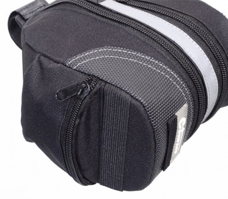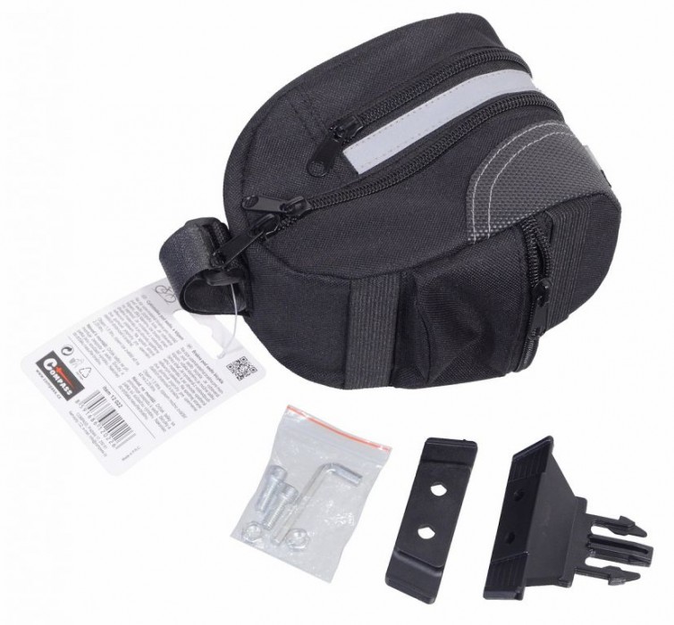 Je vyrobena z vodoodpudivého materiálu a po obvodu opatřena reflexním páskem. Na spodní straně dva gumové popruhy pro upevnění dalších drobností k brašně. Návod k montáži: Držák tašky se přimontuje zespoda k sedlu. Šrouby a patka jsou součástí výrobku. Nakonec se do držáku nasune brašna.