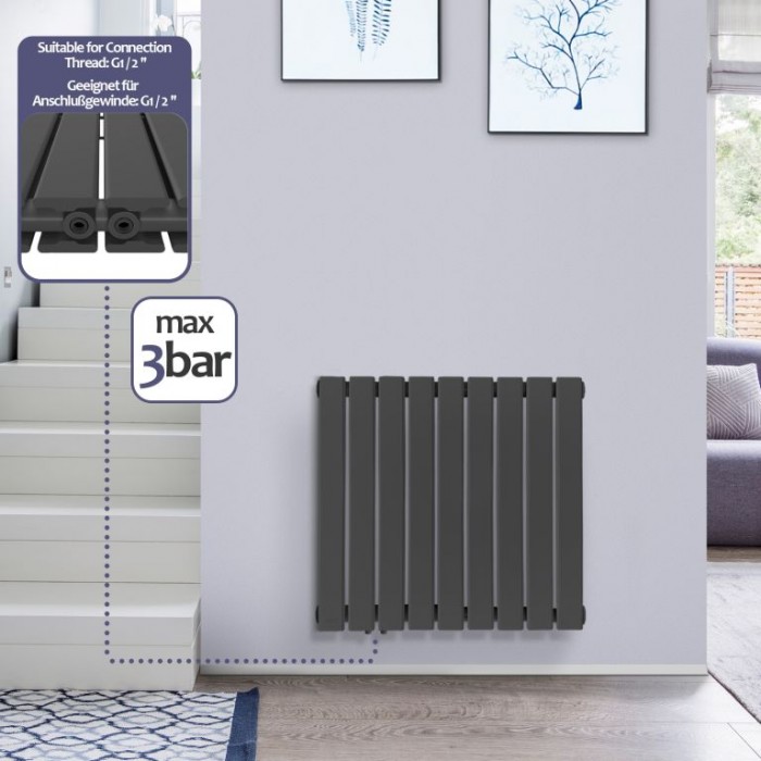 Tento moderní horizontální radiátor nabízí kromě stylového vzhledu také působivý výkon. Poskytuje tepelný výkon 819 W a díky své antracitové ocelové konstrukci a modernímu designu váš domov nejen vyhřeje, ale také zútulní. Poznámka: Radiátorové ventily nejsou součástí dodávky. Tento výrobek není napájen elektrickým proudem.