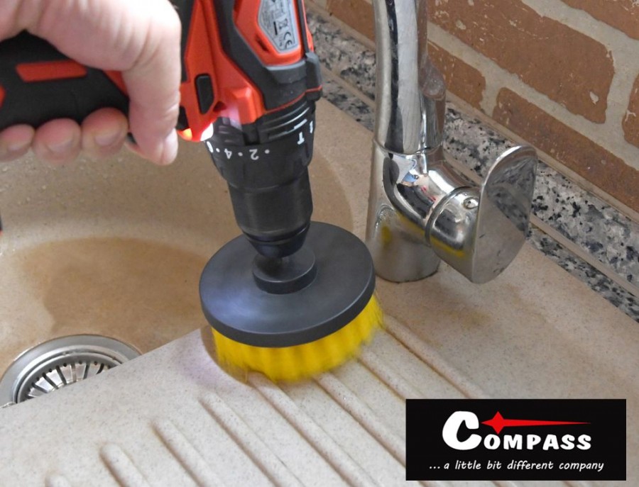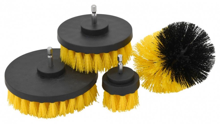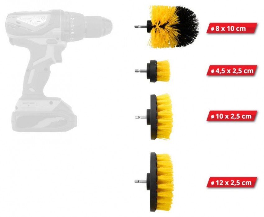 Sada 4 ks čistících kartáčů, hustě osazených nylonovými štětinami střední tuhosti. Sada je složena z kartáčů různých tvarů a velikostí, které zajistí úklid domu i osobního automobilu. Ploché kartáče mají průměr 4,5; 10 a 12 cm s délkou štětin 2,5 cm a praktický tvarovaný kartáč průměru 8 cm, délky 8 cm s délkou štětin 3 cm. Kartáče díky použití nylonových štětin nepoškrábou čištěný povrch a proto je lze použít na vany, dřezy, sprchové kouty, sklolaminát, nebo porcelán, disky kol, interiérové části automobilů a další povrchy. Kartáče mají zakončení 1/4" HEX z nerezové oceli pro snadné uchycení do běžného sklíčidla aku vrtačky.