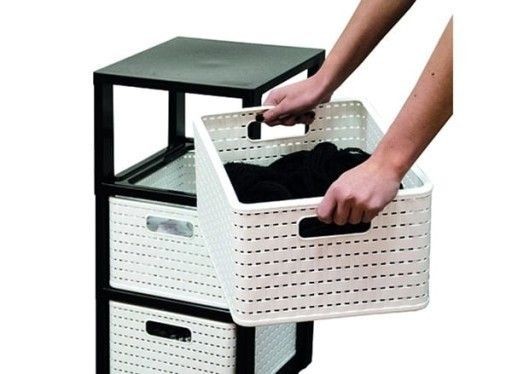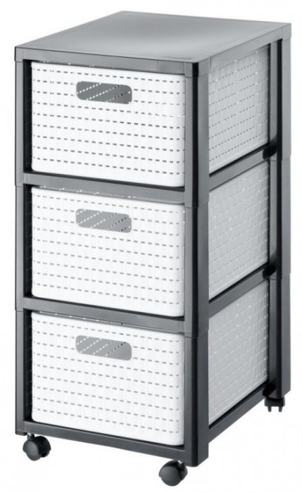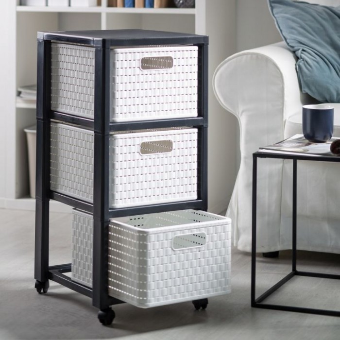 Plastový regál se třemi patry. Tři úložné boxy, které svým vzhledem imitují ratan. Objem boxu je 18L. Kolečka pro jednodušší manipulaci. Moderní a kvalitní provedení.