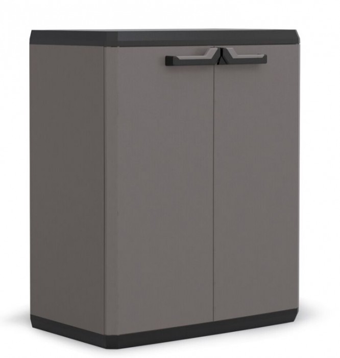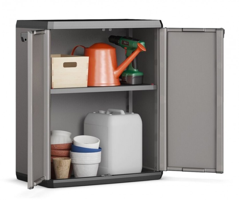 Odolná dílenská skříň vhodná do garáže, na chatu, na terasu nebo do sklepa. Pevné panty, možnost uzamčení a odolnost skříně patří mezí její přednosti. Díky praktickému designu zapadne téměř do každého prostoru a poskytne úkryt pro mnoho pomůcek, nářadí a vybavení. Snadná údržba. Nastavitelná police s nosností každé z nich 15 kg. nízká skříň 1 nastavitelná police nosnost police 15 kg velká odolnost