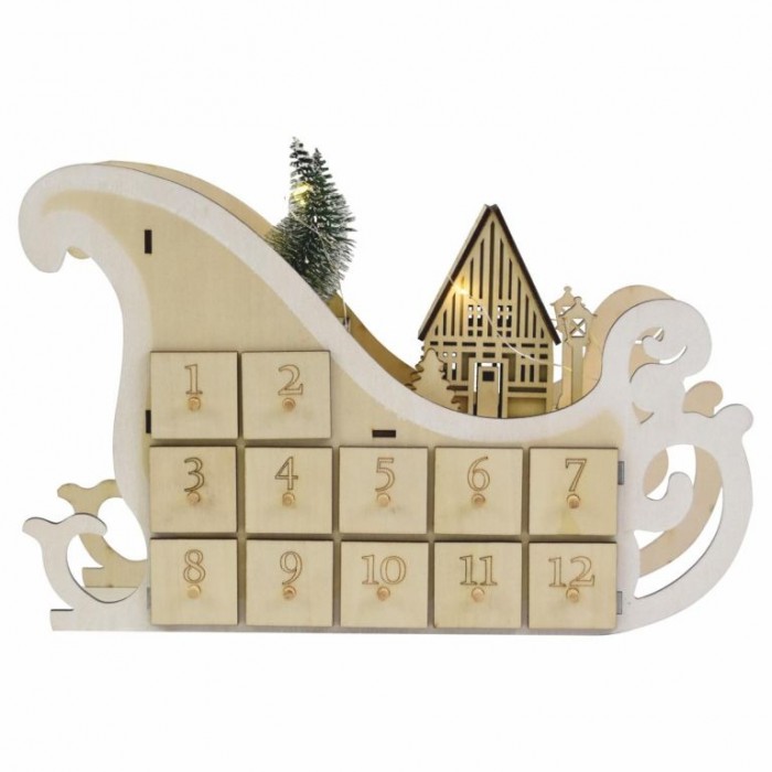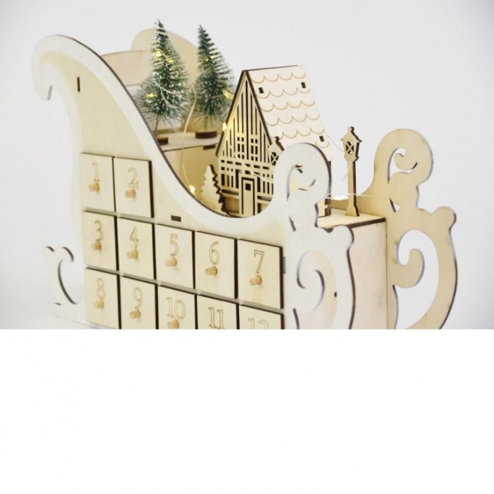 Popis: Vánoční adventní kalendář, sáně, 10 LED, na baterie