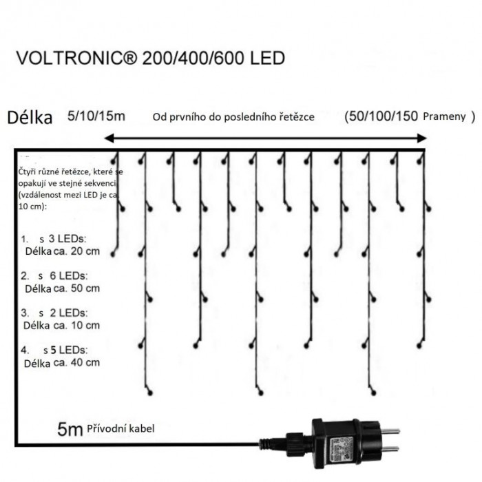 Světelný déšť s 600 LED diodami a teple bílým světlem se stane Vaším oblíbeným vánočním doplňkem. Vytvořte si s tímto osvětlením u Vás doma to pravé vánoční kouzlo. Řetěz má délku osvětlení 15 metrů + 5 metrů přívodního kabelu a je možné ho využít jak ve vnitřních prostorách, tak i venku. LED diody jsou oblíbenou náhradou za klasické žárovky. Oproti klasickým žárovkám LED diody nevyzařují teplo, jsou odolné proti otřesům a můžete díky nim ušetřit až 90% energie, které byste jinak spotřebovali na klasické žárovky. Průměrná životnost LED diody je 2000 hodin svícení (normální žárovka cca 1000 hodin v závislosti na svítivosti). LED řetěz splňuje německé normy a je na něj vystaven certifikát bezpečnosti GS. Splňuje stupeň krytí IP 44 (pro venkovní použití). Bez blikající funkce.