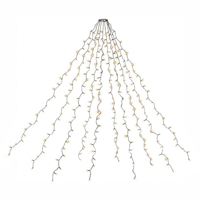 Praktický řetěz ve tvaru kuželu s 280 LED v teplé bílé barvě, rozložený na 8 pramenech po 2 m slouží jako osvětlení na vánoční stromky do výšky 2 m. Přívodní kabel měří cca 5 m. Ideální pro vnitřní i venkovní použití. Prsten stačí nasadit přes vršek stromku a jednotlivé prameny lze flexibilně umístit kamkoli na stromeček. Osvětlení vašeho vánočního stromku bude instalováno během chvilky. LED světla jsou umístěna ve vzdálenosti cca 9 cm. S 8 různými funkcemi máte široký výběr variant osvětlení a je ideální pro zdobení zahrad, teras a balkónů, stromů, keřů a pro atmosférické osvětlení v domácnosti, na večírcích, svatbách, narozeninách, Vánocích a jiných oslavách. Lze použít také jako dekorace na stěny, okna, police a dveře.