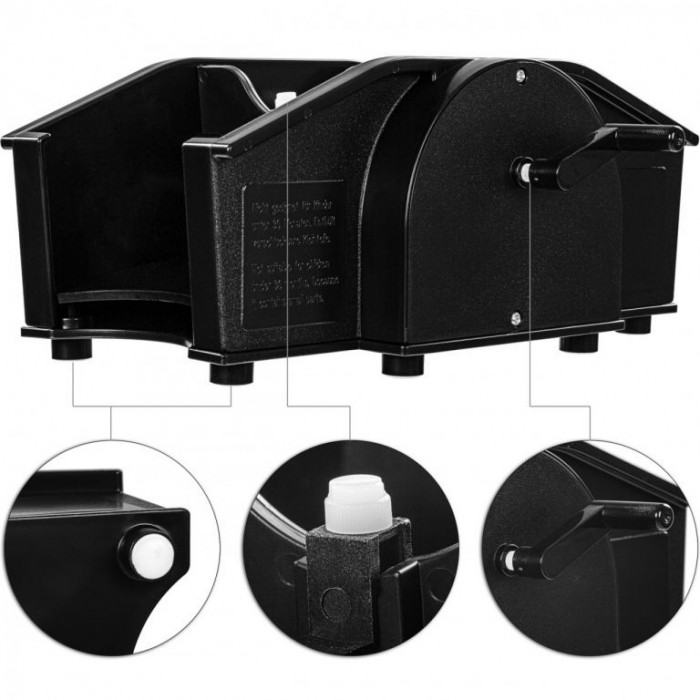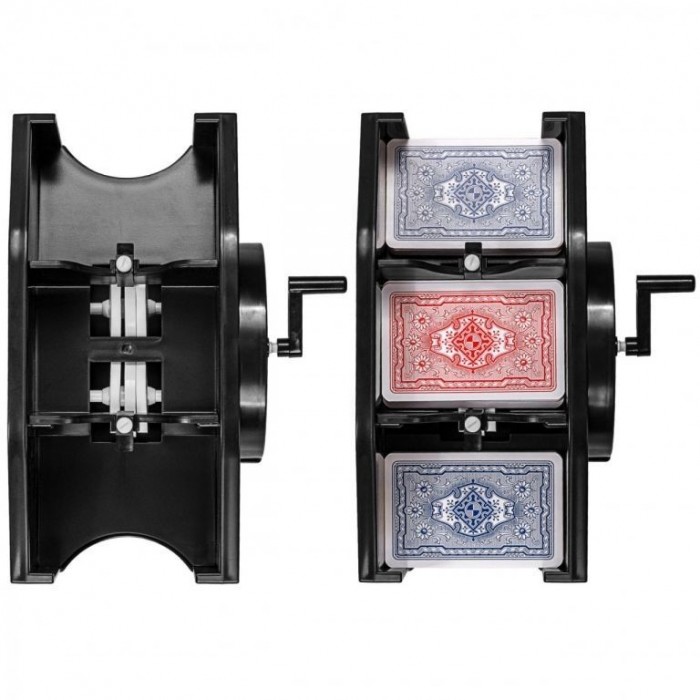 Míchačka karet s ruční klikou snadno a dokonale promíchá karty ve formátu 80-91 x 55-65 cm. Distanční podložky lze nastavit pomocí bílých stavěcích šroubů, takže je vždy zaručeno dokonalé promíchání. Nespornou výhodou je, že pro provoz míchačky není potřeba využít žádné baterie. Produkt je kompletně testován na škodlivé látky.