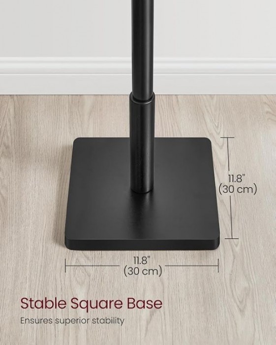 Tento stojan z masivního kaučukovníku zaručuje dlouhou životnost a pevnost. Hlavní tyč o průměru 4 cm poskytuje vysokou stabilitu, zatímco široká čtvercová základna spolehlivě unese až 24 kg. Tři nastavitelné výšky přinášejí flexibilitu pro všechny členy rodiny. Elegantní povrch s trojitou vrstvou laku chrání materiál a zároveň dodává luxusní vzhled.