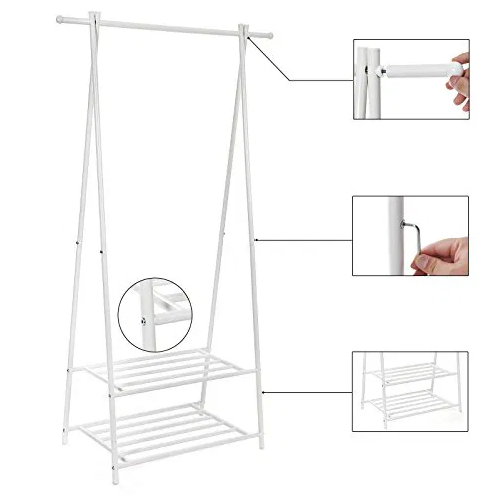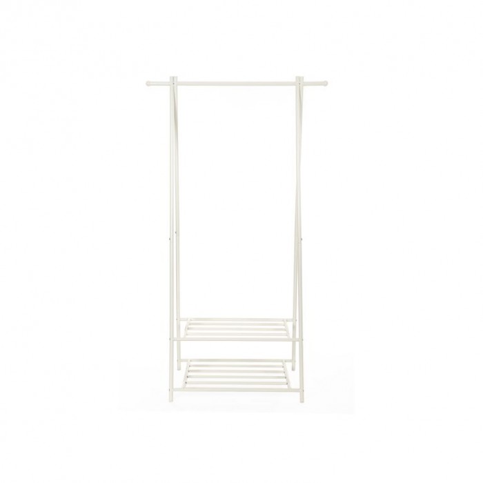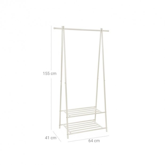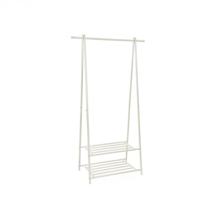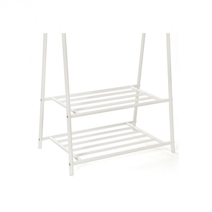 Popis: Kovový stojan na oblečení se dvěma policemi na boty, bílý