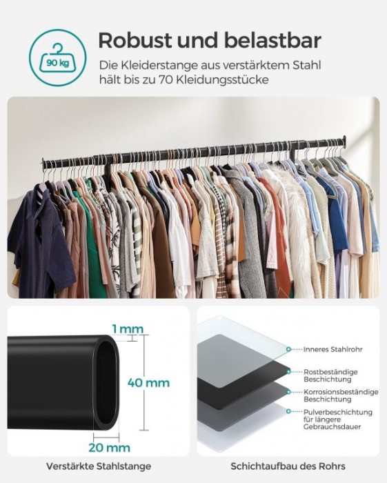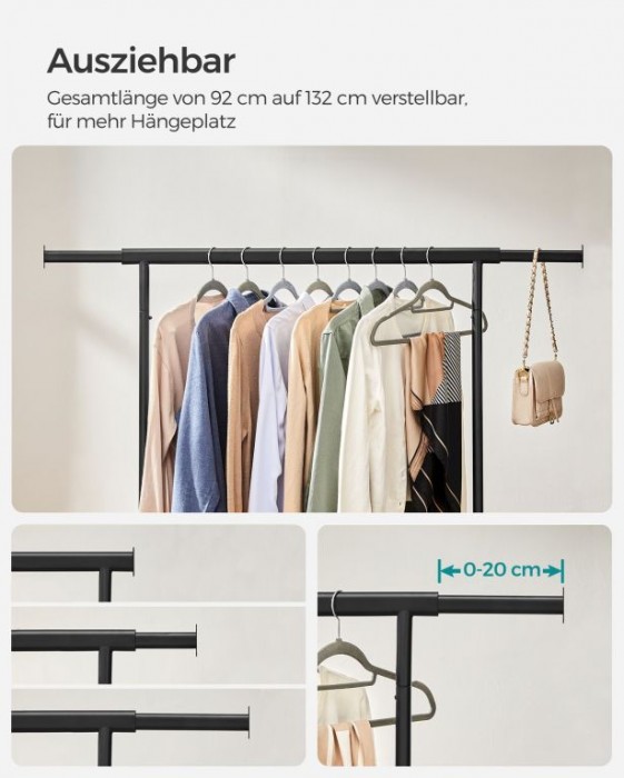 Vytvořte si dokonalý přehled ve svém šatníku s tímto prostorným stojanem na oblečení. Rozšiřitelná horní tyč nabízí místo i pro kabelky či šály, zatímco elegantní černý design skvěle zapadne do každého interiéru.