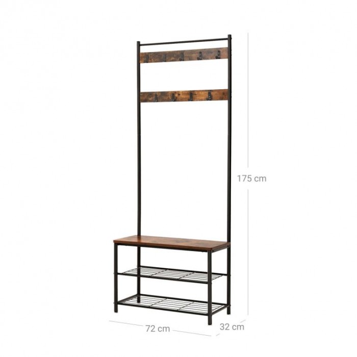 Vytvořte si útulný a organizovaný vstup do domova s tímto stylovým věšákem 3v1. Praktická lavice, devět háčků a dvě police na boty vám usnadní každodenní odchod i návrat domů. Rustikální design dodá předsíni osobitý šmrnc a přivítá každého návštěvníka.