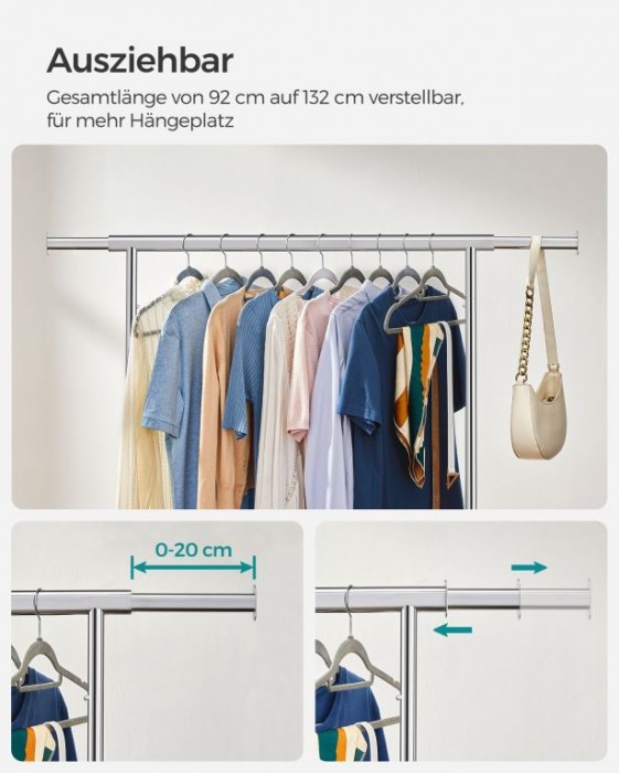 Vneste do svého domova řád a přehlednost. Stříbrný šatní stojan na kolečkách vám poskytne dostatek místa na veškeré oblečení i doplňky. Výsuvná horní tyč a boční konce jsou ideální na kabelky, šály či klobouky. Perfektní volba pro každodenní použití i sezónní uskladnění.