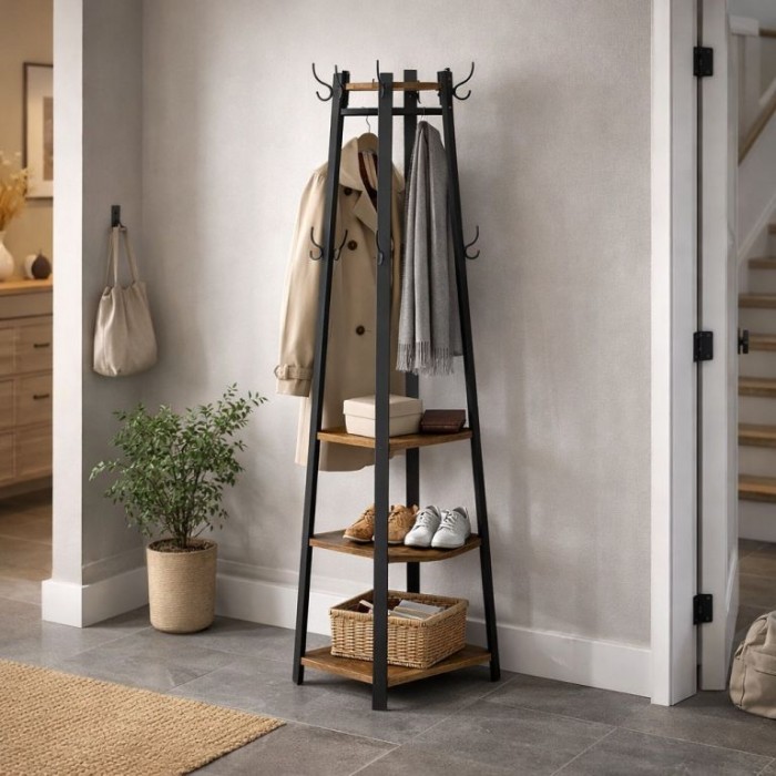 Vneste do svého domova kombinaci praktičnosti a designu. Tento elegantní stojan na kabáty v rustikálním hnědo-černém provedení je ideální pro předsíň, obývací pokoj nebo kancelář. Nabízí prostor pro bundy, tašky i doplňky, které budou mít konečně své místo. Díky svému industriálnímu vzhledu dodá interiéru moderní a útulnou atmosféru.