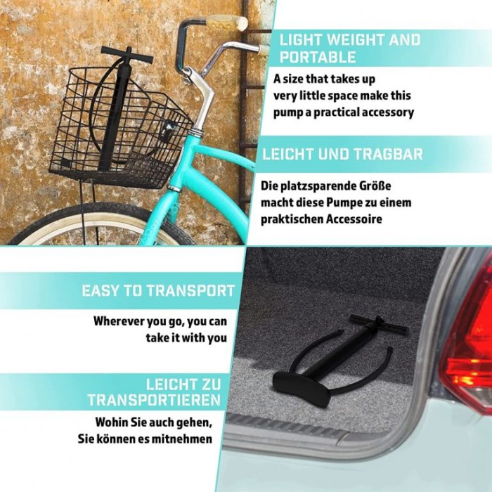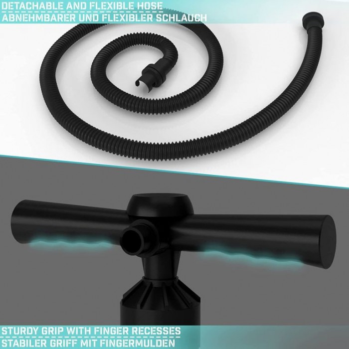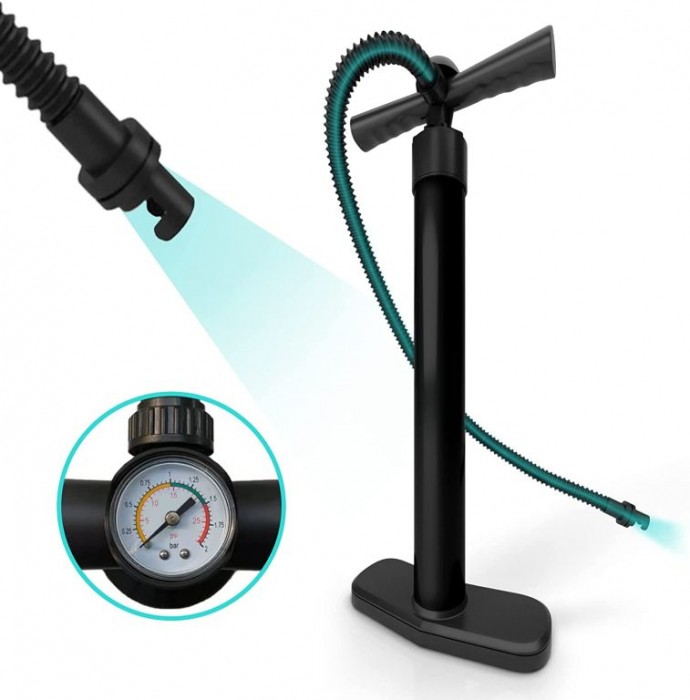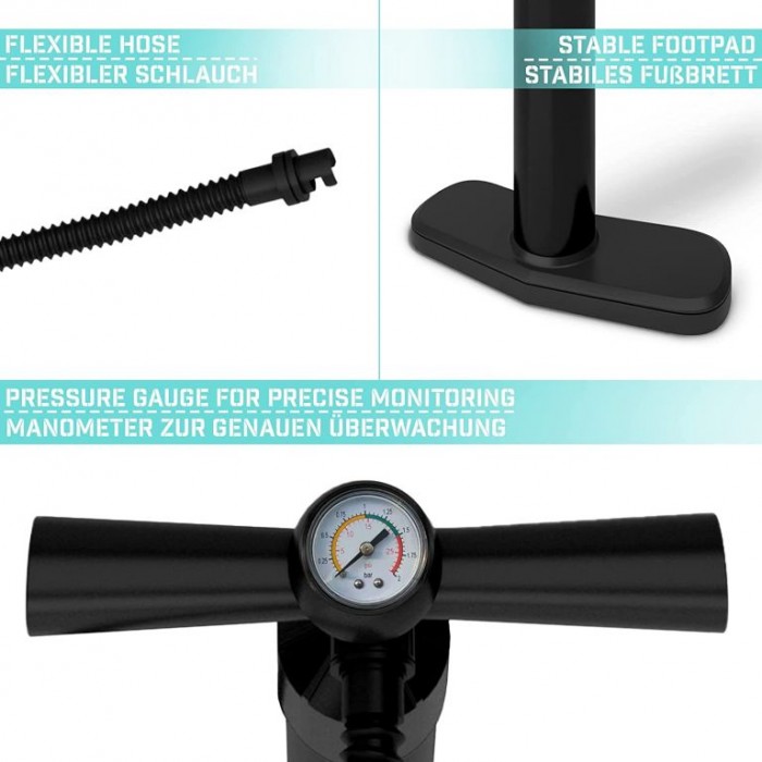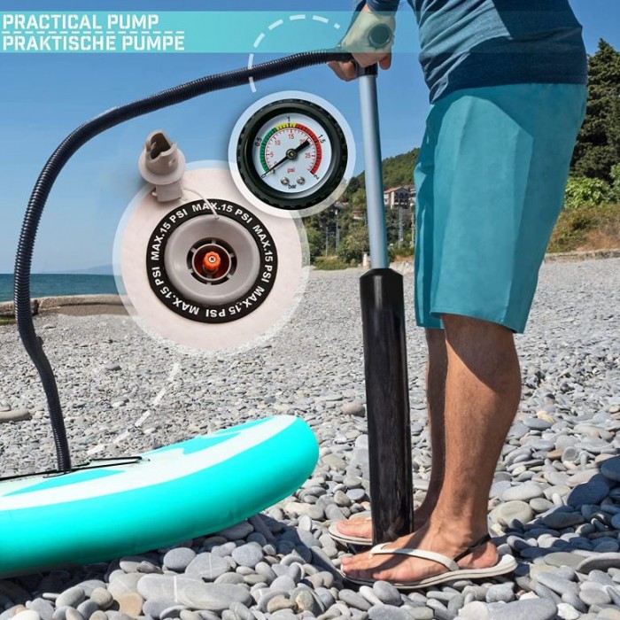 Pokud se rádi zahřejete před volnočasovými aktivitami, je tato stojací pumpa ideálním fitness přístrojem před začátkem pádlování. Vybaven manometrem, který dosahuje až 25 psi, můžete s touto vzduchovou pumpou nafouknout všechny běžné Paddleboardy. Manometr stojací pumpy se nachází na horní straně rukojeti a je tak dobře čitelný. Robustní rukojeť a nožní deska pro stabilní čerpadla, nízká hmotnost a velikost nezabere téměř žádné místo a díky tomu se tato vzduchová pumpa stane praktickým doplňkem, který můžete vzít s sebou na každou cestu.