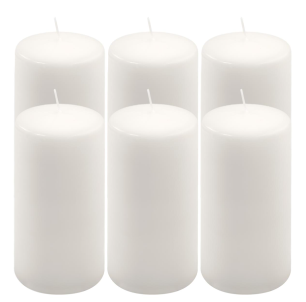 Všestranné sloupkové svíčky - Sada šesti svíček, které lze použít jako vánoční a narozeninové svíčky, stolní svíčky nebo dokonce do svícnu. Tyto sloupkové svíčky jsou ideální pro příležitosti, jako jsou narozeniny, svatby, večírky, oslavy, rodinná setkání nebo i překvapení, a poskytují příjemné světlo. Tato sada obsahuje šest vysoce kvalitních bílých sloupkových svíček o průměru 7,5 cm a výšce 15 cm. Svíčky jsou bez parfemace, hoří rovnoměrně a lze je snadno a opakovaně zapálit. Upozornění: Hořet pouze v žáruvzdorných svíčkách –