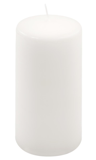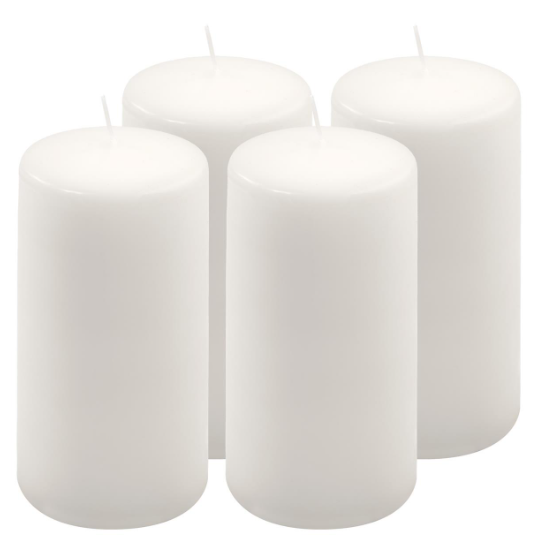 - svíčky: 4 × bílá sloupková svíčka (15 cm × Ø 7,5 cm)