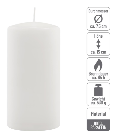 Každá svíčka má průměr 7,5 cm a výšku 15 cm, je vyrobena ze 100 % parafínu a nabízí cca 65 hodin rovnoměrného hoření. Svíčky jsou neparfémované, stabilní a vhodné pro použití v různých svícnech či stolních dekoracích. Ideální pro opakované zapalování i dlouhodobé použití.