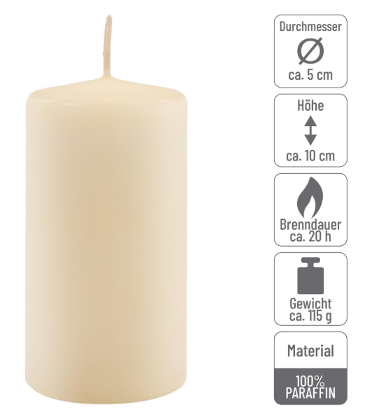 Svíčky jsou vyrobeny ze 100% parafínu, mají hladký povrch a neobsahují žádné vonné přísady. Průměr 5 cm a výška 10 cm zajišťují dlouhou dobu hoření – až 20 hodin na jednu svíčku. Snadné opakované zapalování a rovnoměrné hoření ocení každý, kdo hledá kvalitu a spolehlivost.