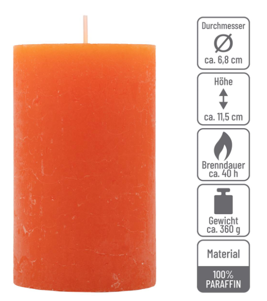 Tyto sloupkové svíčky jsou ideální pro příležitosti, jako jsou narozeniny, svatby, večírky, oslavy, rodinná setkání nebo i překvapení, a poskytují příjemné světlo. Tato sada obsahuje šest vysoce kvalitních oranžových rustikálních sloupkových svíček o průměru 6,8 cm a výšce 11,5 cm. Svíčky jsou bez parfemace, hoří rovnoměrně a lze je snadno a opakovaně zapálit. Upozornění: Hořet pouze v žáruvzdorných svíčkách – nikdy nenechávejte hořet bez dozoru. Prohlédněte si také naše další sady svíček. Nabízíme svíčky v široké škále barev, materiálů a velikostí.