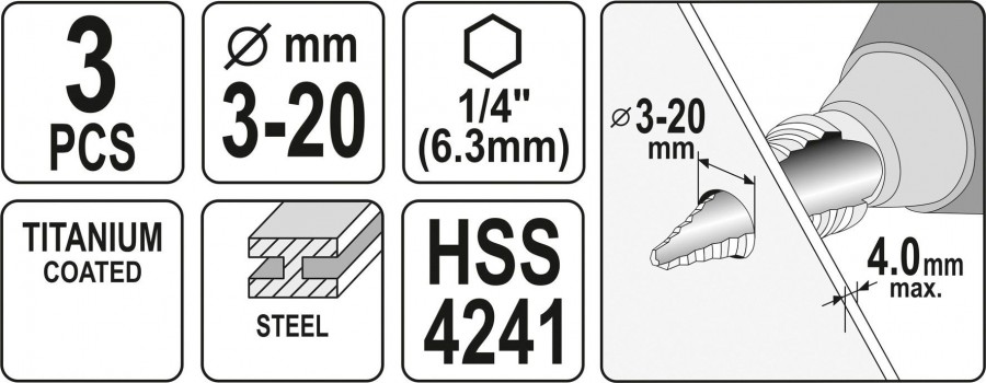 Popis: Sada stupňovitých kuželových vrtáků 3-20mm