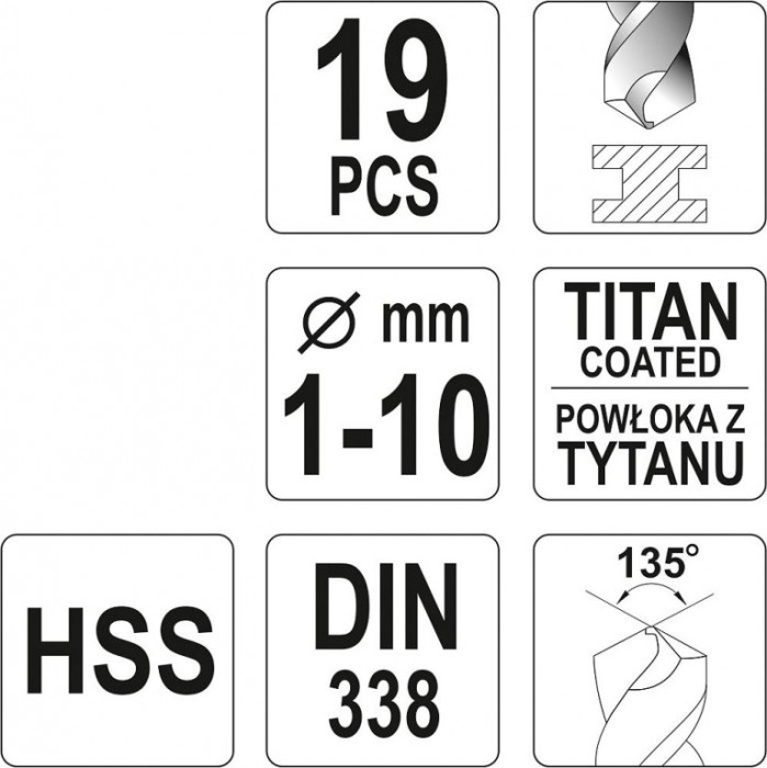 Popis: Sada vrtáků do železa HSS-TiN 19ks 1-10mm