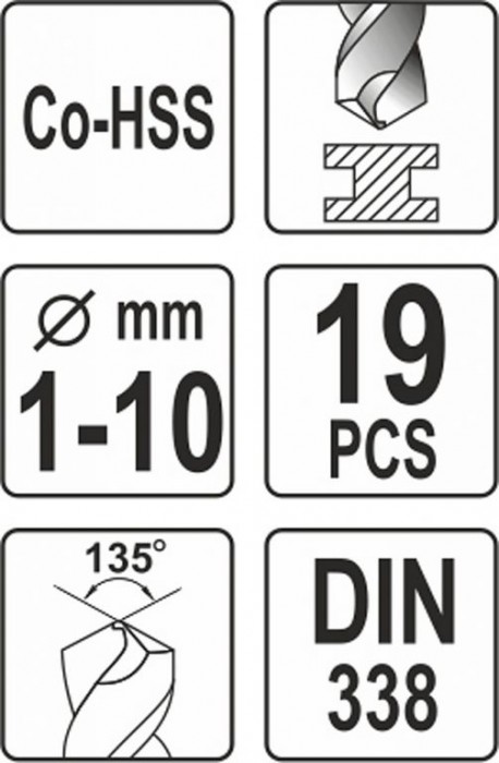 - obsahuje vrtáky: 1; 1,5; 2; 2,5; 3; 3,5; 4; 4,5; 5; 5,5; 6; 6,5; 7; 7,5; 8; 8,5; 9; 9,5; 10 mm