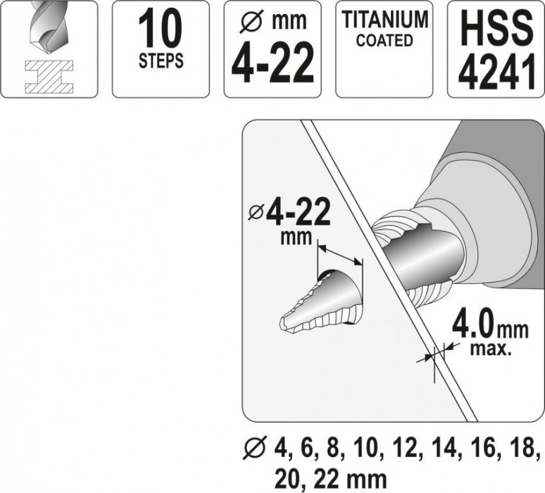 Každý jednotlivý stupeň může vrtat otvor do maximální hloubky 4 mm. Celkově je vrták vybaven 10 stupni o průměrech 4; 6; 8; 10; 12; 14; 16; 18; 20 a 22 mm.