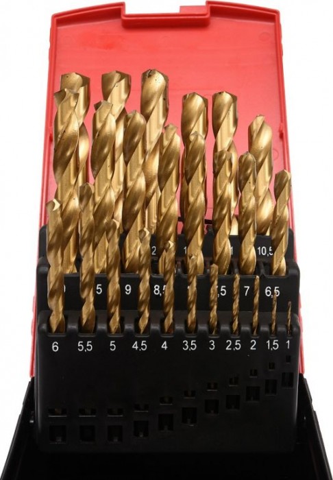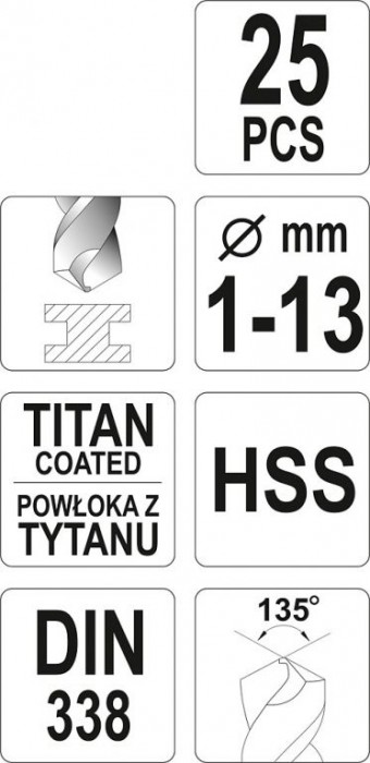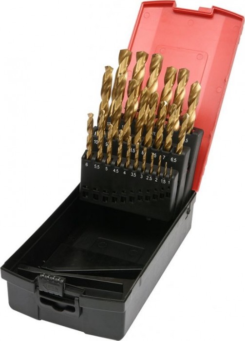 Sada vrtáků s agresivní geometrií břitů. Díky povlaku z nitridu Titanu, vrtáky rychle odvádějí teplo a neztupí se při vrtání u pevných ocelí. Řezný úhel 135° dovoluje vrtání bez nutnosti použití důlčíku. Vrtáky jsou vhodné pro průmyslové použití. Sada se skládá z 25 ks vrtáků od 1 - 13 mm uložených v plechové krabičce.