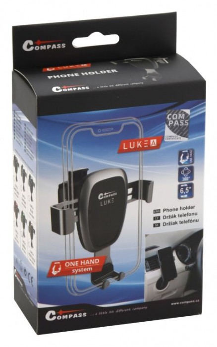 Univerzální držák telefonu řady LUKE pro upevnění do mřížky ventilace a umístěním telefonu jednou rukou. Držák je opatřen gravitačním systémem uchycení telefonu, kdy telefon svojí vahou působí na spodní rameno držáku, díky čemuž se stáhnou boční ramena, která telefon upevní. Tělo držáku je dále opatřeno kloubem s aretačním prstencem, díky kterému je možné držák nastavit pro potřebný sledovací úhel a dotažením zajistit.