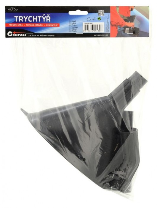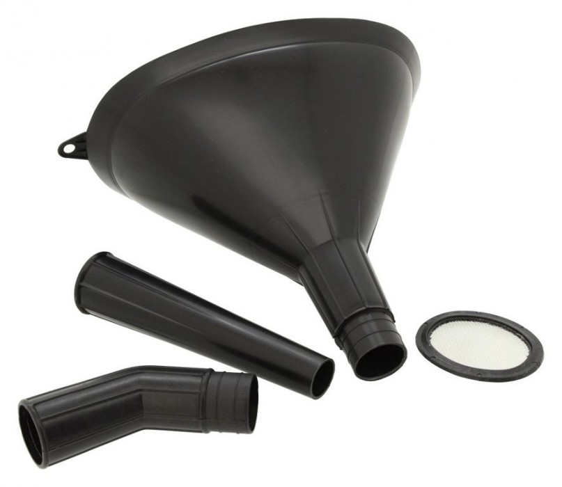 Trychtýř s nálevkou je ideální pomocník pro plnění všech běžných technických kapalin. V trychtýři z odolného plastu je vloženo kovové sítko jako ochrana před mechanickými nečistotami. Rozměry trychtýře jsou pro nálevku 22 x 13,5 cm, průměr hrdla 3 cm, délka rovného nástavce 15 cm a navíc se v sadě nachází kolínko s úhlem 45° a dlouhé 13 cm.