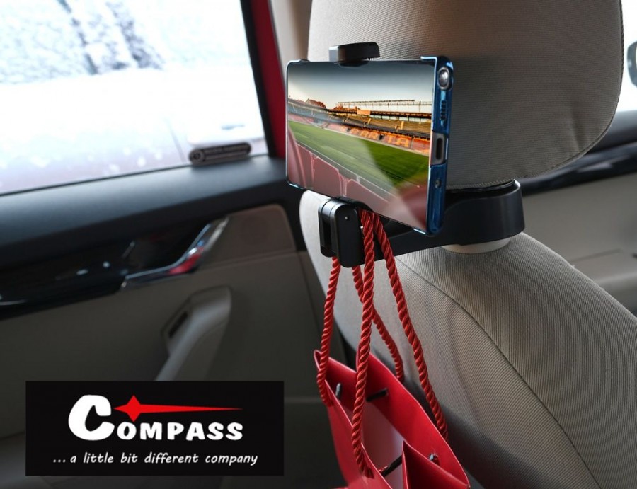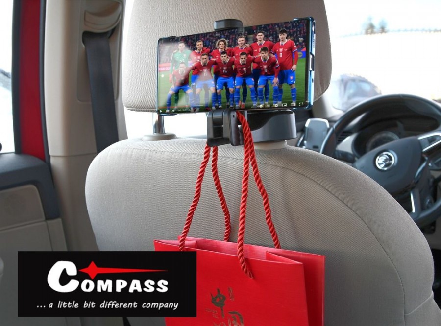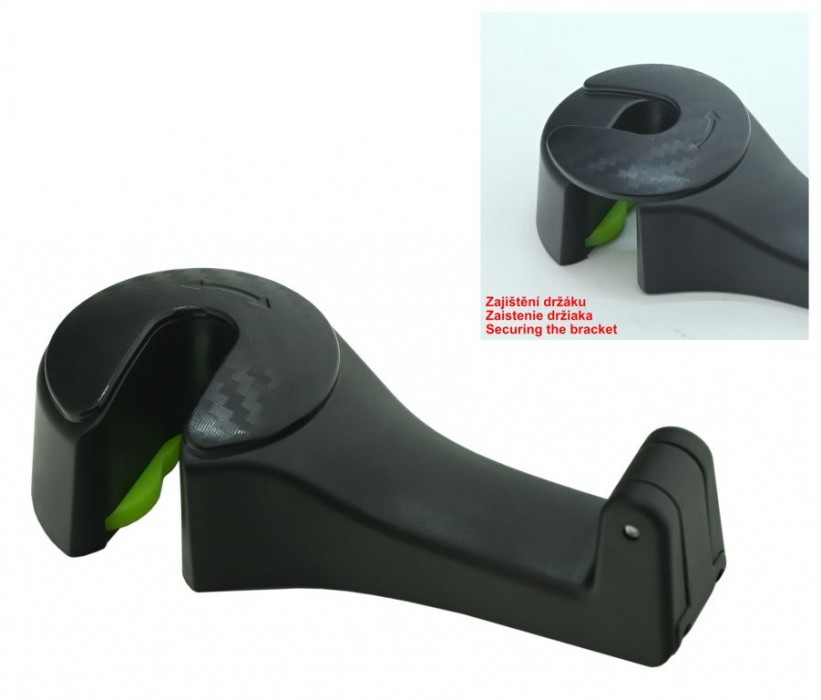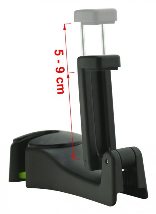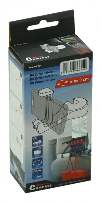Rozsah úchytu pro telefon 5 - 9 cm. Díky těmto rozměrům, je možné použít tento držák pro většinu mobilních telefonů na trhu. Držák telefonu lze díky vysouvacímu ramenu úhlově nastavit a lze jím otáčet okolo osy tyčky hlavové opěrky. Držák lze na hlavové opěrce zajistit pomocí vrchního otočného prstence. Držák je navíc opatřen výstupkem pro možnost uchycení tašky s lehkým obsahem.